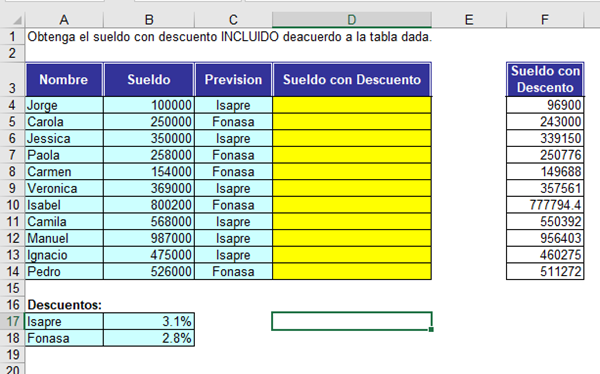 Chicos como aplico la función si con el descuento, en las celdas amarillas tiene que salir lo de la columna derecha.