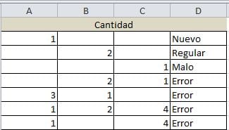 Tengo 3 columnas A1, B1, C1 y en la columna D1 necesito colocar alguna función que me de automáticamente que si está en A1= Nuevo si Está en B2=Regular, Si está en C1=Malo y si hay 2 o 3 columnas con números ponga error. En la columna D