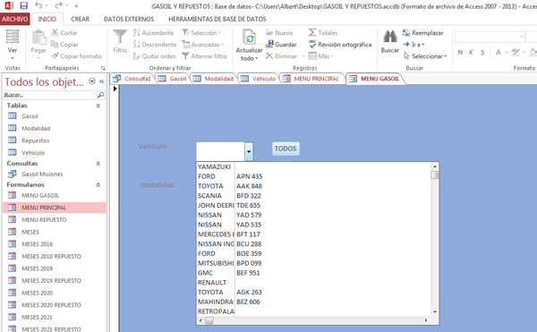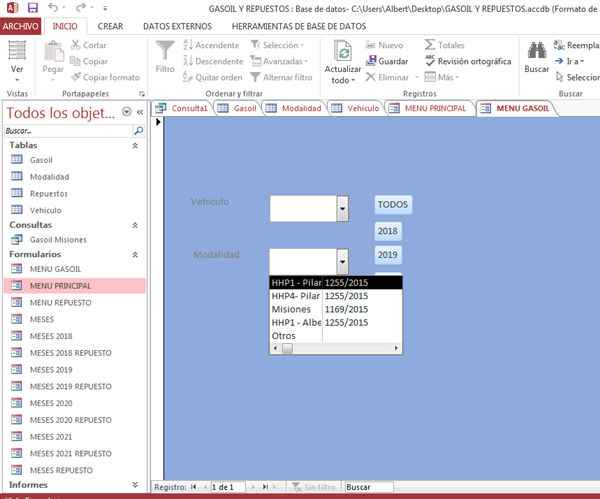 Tengo 4 tablas: Vehículos, Gastos en gasoil, Modalidad(tipo de trabajo en el que se usa el vehículo) y repuestos. Y necesito hacer consultas por ejemplo gastos de vehiculo1 en el mes de febrero en la modalidad1, y así sucesivamente, son como 5 modalidades, 31 vehículos y para todos los vehículos y modalidades va a ser demasiado complicado, ¿habriauna fora de en un formulario seleccionar el vehículo y la modalidad y luegoel mes y año para simplificarlo?