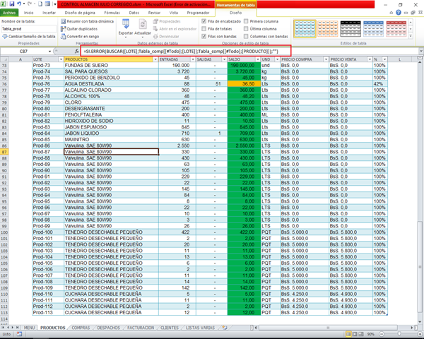 Lo que quisiera es que en la hoja llamada Producto en su tabla llamada "Tabla_prod" me muestre las entradas, salidas y lo que me queda de cada lote de cada producto. Yo utilice la función Buscar, me funciona pero a medida que agrego productos empieza a repetirme el resultado