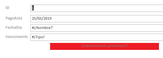 PagoAsta y una fecha del día =Fecha(), también un cuadro de texto donde me aparecen los días que faltan para el vencimiento Texto80 con la instrucción =DifFecha("d";[FechaDia];[PagoAsta]) ,lo que quisiera es poner un aviso que apareciera cuando falten x días para la fecha a vencer.