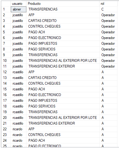 Estimados necesito de su ayuda ya que me están pidiendo que generé un reporte de roles configurados por producto de un sistema, esto por un cliente en específico, pero resulta que tengo 2 tablas en una tabla tengo el usuario, producto y rol y en otra tengo la descripción del rol, me están pidiendo que en las columnas ponga el producto, no se como hacer la consulta en SQL para que el resultado me muestre los productos en las columnas y en cada una de las columnas me ponga el rol que tiene cada usuario y para el caso que un usuario no tenga acceso al producto que muestre "Sin Acceso", se que existe una funcion en SQL que es PIVOT que convierte filas en columnas pero no se como utilizarla