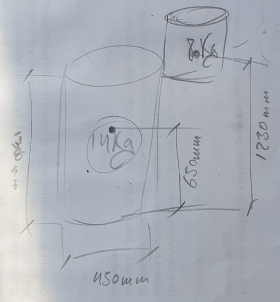 Estoy realizando un proyecto de diseño de producto y he pensado en añadir un apartado donde demuestre que mi diseño es estable. El problema es que hace muchos años que estudié física y ya no recuerdo cómo se resuelve, he intentado buscar en internet cómo realizarlo pero no lo consigo. El diseño, en resumen, es un cilindro de 130cm de alto y 45cm de diámetro, luego lleva otro dos cilindros más pequeños enganchados en la parte superior, de manera tangente a él por la parte exterior de la circunferencia. El caso más extremo es cuando sólo uno de los otros dos cilindros pequeños (de los dos, el más grande, de 42cm de diámetro y 38cm de alto) se coloca enganchado al primero. Según mi programa de CAD, el objeto más grande pesa 14kg y tiene el centro de masas a una altura de 65cm, el otro más pequeño pesa 8kg y su centro de masas está a 14cm de su base, el cual quedaría a 123cm del suelo. No sé si hace falta algún dato más. Necesito resolverlo de manera que demuestre que no se va a volcar, que es estable. Muchas gracias de antemano. Un saludo.