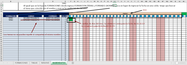 Me explico, si en la tabla numero 1 (la que se encuentra en la hoja de FORMACIONES) yo agrego datos, si esos datos coinciden en tema y nombre (hoja DASEDEBATOS) agregue una "F" en la celda donde coincida el nombre (Columna D) el tema (Columna B) y a su vez la celda del día del mes de enero.