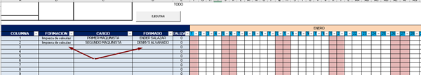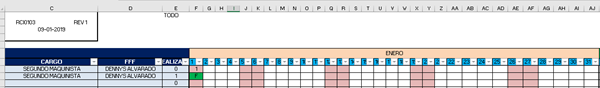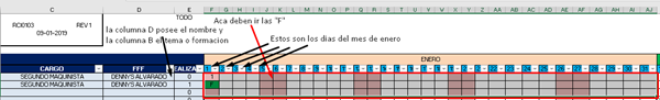 La tabla siguiente que se encuentra en la hoja "BASEDEDATOS" necesito que aparezca la letra "F" en las celdas que tengan la coincidencia de el dia del mes de enero (coincidan fecha) con la FORMACION y el NOMBRE.