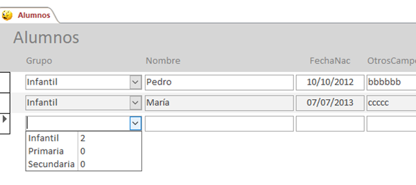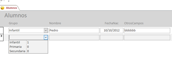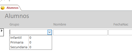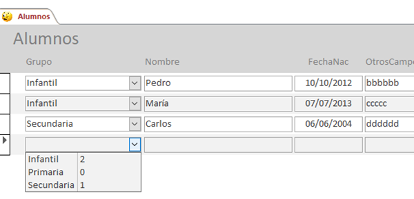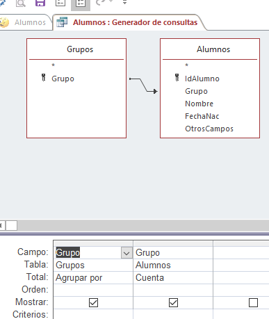 En una tabla figuran los alumnos y en otra en los grupos. Ambas están relacionadas a través de un campo llamado [grupo].