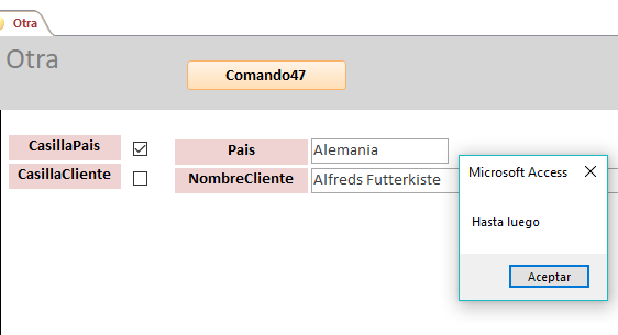 Private Sub Comando477_Click() If MotoresSitja = 0 And IsNull(CualMotoresSitja) Then MsgBox "Debes rellenar Cuál de los Motores está NOK" ElseIf ReductoresSitja = 0 And IsNull(CualReductoresSitja) Then MsgBox "Debes rellenar Cuál de los Reductores está NOK" ElseIf CadenasSitja = 0 And IsNull(CualCadenasSitja) Then MsgBox "Debes rellenar Cuál de las Cadenas está NOK" ElseIf CorreasSitja = 0 And IsNull(CualCorreasSitja) Then MsgBox "Debes rellenar Cuál de las Correas está NOK" ElseIf CojinetesSitja = 0 And IsNull(CualCojinetesSitja) Then MsgBox "Debes rellenar Cuál de los Cojinetes está NOK" ElseIf EngranajesSitja = 0 And IsNull(CualEngranajesSitja) Then MsgBox "Debes rellenar Cuál de los Engranajes está NOK" ElseIf CilindrosSitja = 0 And IsNull(CualCilindrosSitja) Then MsgBox "Debes rellenar Cuál de los Cilindros está NOK" ElseIf TelerasSitja = 0 And IsNull(CualTelerasSitja) Then MsgBox "Debes rellenar Cuál de las Teleras está NOK" DoCmd.CancelEvent Else DoCmd.Close DoCmd.OpenForm "FormRegistroCardayTorre", , , , acFormAdd, acDialog End If End Sub