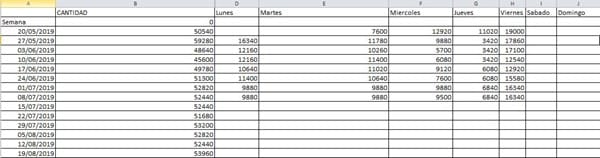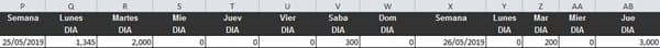 Tengo una hoja de excel(IMAGEN1) la cual tiene varias semanas y cada semana tiene sus días (Lunes, Martes, Miércoles, Jueves; viernes, Sábado y Domingo) lo que pretendo es copiar la fecha de la semana e ir escribiendo sus días a su ldo derecho que se vaya semana por semana y vaya colocando los datos en otra hoja de excel