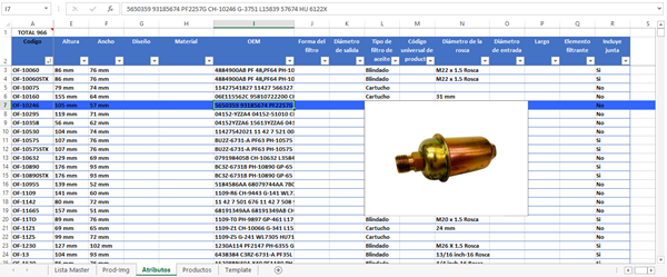 Los valores buscados se encuentran en la hoja llamada Atributos a partir de la columna A3 y los valores de coincidencia a partir de la celda E2 hacia la derecha