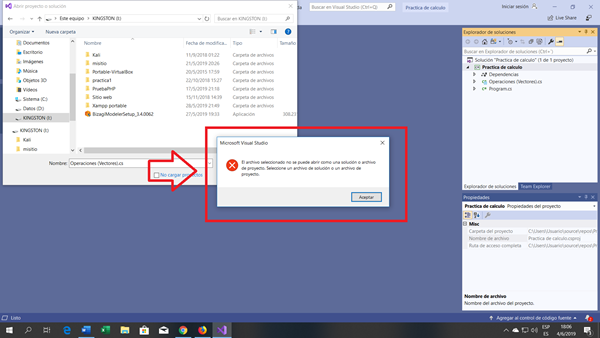 Error al abrir achivo de Visual Studio 2019 desde el USB