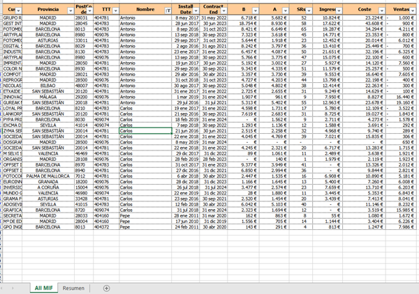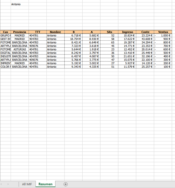 Los expertos. Tengo una tabla de excel donde cada línea es un conjunto de datos sobre un cliente. Necesito una macro que busque el valor de la celda B2 de la hoja Resumen en cada línea de la hoja All MIF (2000 líneas) y copie los valores de algunas celdas como A, B, F, L, X a partir de la celda A10 de la hoja resumen y que incluya la cabecera.