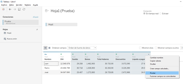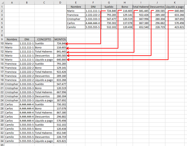 Tengo una lista de trabajadores con sus datos remunerativos mensuales en forma horizontal. Necesito pasarlos a una forma vertical, repitiendo el registro de nombres de los trabajadores y los conceptos hacia abajo en una columna.