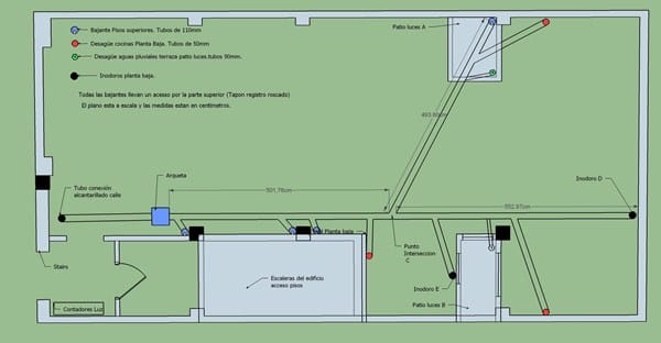Como desde las bajantes hasta la arqueta hay muchos metros (casi 10 metros desde el patio luces A, así como del Inodoro D a la arqueta. Vean plano acotado), me preocupa que se vuelva a embozar de nuevo por no colocar las cosas como es debido.