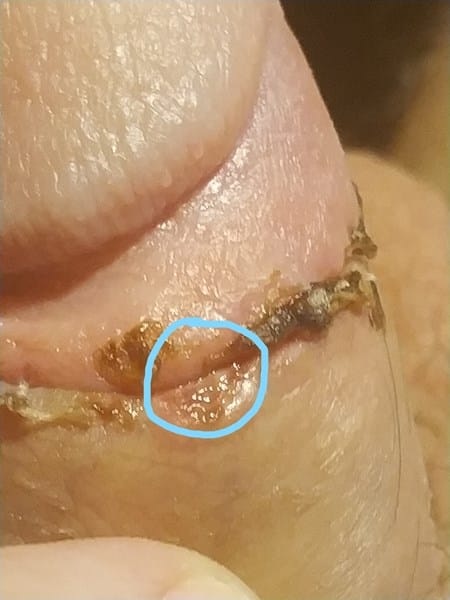 Como al lado de done señalo, sigo teniendo puntos, pero esa zona está sin punto, y como que se ve la zona más tierna, según me dijo el médico si solo se saltaba un punto no pasa nada, pero no estoy del todo tranquilo.