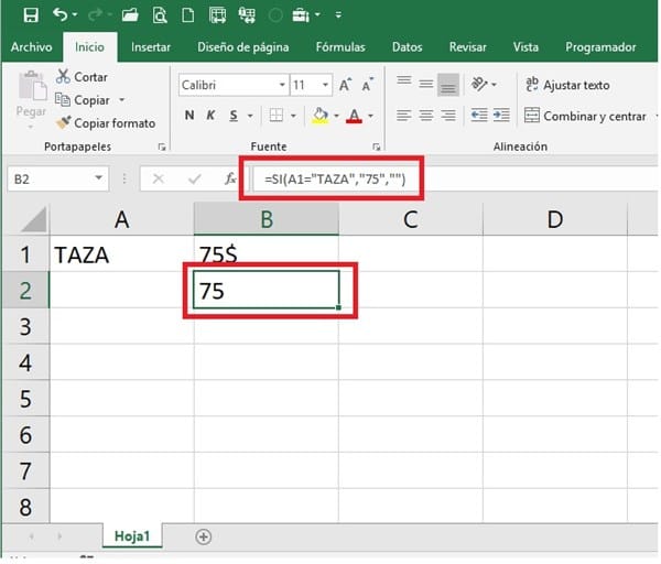 Como hago para escribir un nombre en celda A1 y que automáticamente me salga un numero en celda B2 ejemplo TAZA(a1) = 75$(b1)