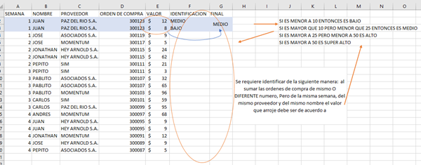 Aquí te relaciono la imagen en donde en la columna G es donde está lo final que requiero que de acuerdo a la semana, nombre y proveedor coloque el nivel final