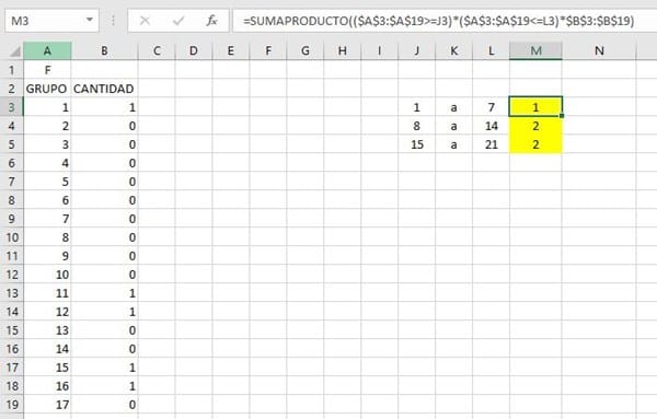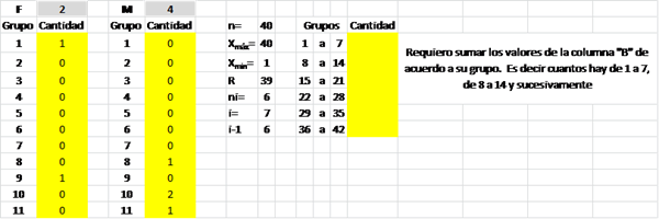 Mi tabla tiene en la columna "A" los grupos (edades) y en la columna "B" las cantidades (Nº personas), requiero sumar según una escala las cantidades de personas de acuerdo a las edades: