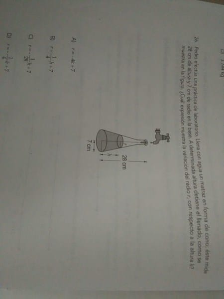 Pedro efectúa una practica de laboratorio. Llena con un matraz en forma de cono; éste mide 28 cm de altura y 7 cm de radio en la base. A determinada altura detiene el llenado, como se muestra en la figura. ¿Cuál expresión muestra la variación del radio r, con respecto a la altura h?