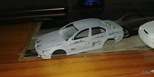 La pieza debe de lijarse con una lija de agua muy fina. Se trata de un lijado superficial rápido para abrir el poro de la superficie en la medida de lo posible. Una vez lijado, debemos hacer una limpieza exahustiva, y tratarlo con un desengrasante, de este modo evitamos restos de contaminación que dificulten la adherencia de la pintura.