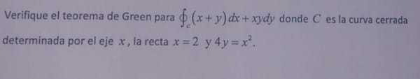 $$\begin{align}&\int_\varGamma F.tds=\int_\varGamma Pdx+Qdy=\int_a^b P(t)x'(t)+Q(t)y'(t) \,dt\\&F=(x+y)dx+(xy)dy\\&\varGamma=c1+c2+c3\\&\\&c1=x=0 \\&x=t,y=0\\&0< t<2\\&\\&F=\int_0^2 t dt=2\\&\\&c_2=x=2\\&x=2\\&y=t\\&0< t<1\\&\\&\int_0^1 2t dt=1\\&\\&c_3=y=\frac{x^2}{4}\\&x=t\\&y=\frac{t^2}{4}\\&0< t <2\\&\\&\text{En este caso nosotros queremos que toda C se mueva en sentido antihorario}\\&\text{Con la parametrizacion que tenemos C3 se mueve de izquierda a derecha (pero en sentido contrario a las demas por lo que }\\&\text{debemos tomar el valor negativo}\\&-\int_0^2 t+\frac{t^2}{4}+\frac{t^3}{4}(\frac{t}{2}) dt=- \frac{t^2}{2}-\frac{t^3}{12}-\frac{t^5}{40} \bigg]_0^2=-\frac{52}{15}\\&-\frac{52}{15}+2+1=-\frac{7}{15}\\&\\&\\&\\&\\&\\&\\&\\&\end{align}$$