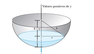 $$\begin{align}&A= \pi r^2\\&\text{Usando el teorema de pitagoras para hallar el radio de esas circunferencias tenemos}\\&16=r^2+(4-y)^2\\&r^2=8y-y^2\\&\\&A= \pi (8y-y^2)\\&\\&\text{Sustituyamos en la ec diferencial, el valor del orificio lo hacemos luego, es cte al fin y al cabo}\\&\\& \pi (8y-y^2)y'=-a \sqrt{2gy}\\&\int \frac{\pi (8y-y^2)}{\sqrt{2gy}}dy=-a \int \, dt\\&\frac{\pi}{\sqrt{2g}}\int \frac{8y}{\sqrt{y}}-\frac{y^2}{\sqrt{y}} dy=-a \int \, dt\\&\frac{\pi}{\sqrt{2g}} \int 8 \sqrt{y} - y^\frac{3}{2}dy=-a \int \, dt\\&\frac{\pi}{\sqrt{2g}} \bigg(\frac{16}{3} y^\frac{3}{2}-\frac{2}{5} y^\frac{5}{2}\bigg)=-at\\&\end{align}$$Vamos a poner limites de integracion, en t=0 el tanque esta lleno, por lo que el valor de y es el radio de esa tanque y(0)=4, y en t=to el tanque esta vacio y(to)=0