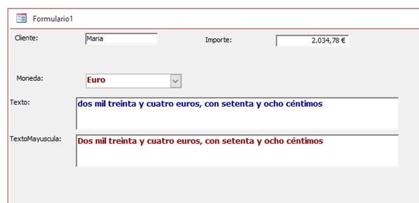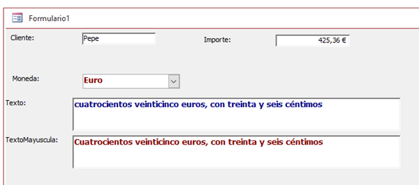 Me he bajado una programa en access para poder pasar numeros a letras. La verdad es que parece funcionar muy bien. Lo he añadido a un formulario en modo invisible dejando solamente visible el resultado en letras. Consigo que a cada cambio de registro del formulario se actualice la casilla de entrada de datos en el "programa" poniendo: