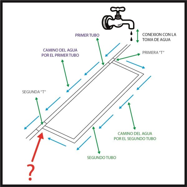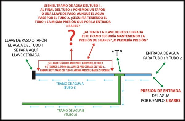 Como el agua viene por la tubería 1, se bifurca hacia la tubería 2 y luego la tubería 2 vuelve a conectar con la tubería 1 uno o dos metros más adelante, ¿qué pasará en la segunda T? ¿Recibe más presión? ¿Se partirá?