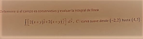 $$\begin{align}&Q_x=2\\&P_y=2\\&\nabla x F=2-2=0\\&\text{Es conservativo}\\&\\&f_x=P=2(x+y)\\&f_y=Q=2(x+y)\\&\\&\text{Quizas notes la relacion con las ecuaciones diferenciales exactas}\\&\text{se resuelve igual}\\&\\&f_x=2(x+y)\\&\int f_x dx=\int 2(x+y) dx\\&f=x^2+2xy+ h(y)\\&\\&f_y=2x+h'(y)=Q\\&2x+h'(y)=2(x+y)\\&h'(y)=2y\\&\int h'(y) dy = \int 2y dy\\&h(y)=y^2+C\\&\\&f(x,y)=x^2+2xy+y^2+C\\&\\&f(4,3)-f(-2,2)=4^2+2(4)(3)+3^2+C-((-2)^2+2(-2)(2)+2^2+C)=49\\&\end{align}$$