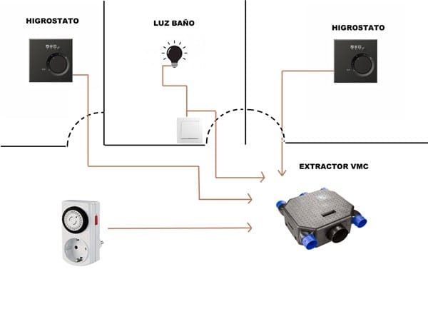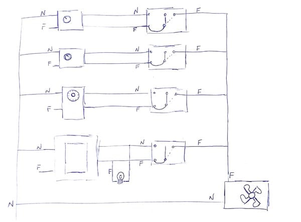 A ver si alguien me puede ayudar con el diseño de un esquema eléctrico de conexión. Necesito conectar un extractor de ventilación mecánica que voy a instalar en un sótano y que deberá ponerse en marcha de cuatro formas diferentes compatibles entre si: