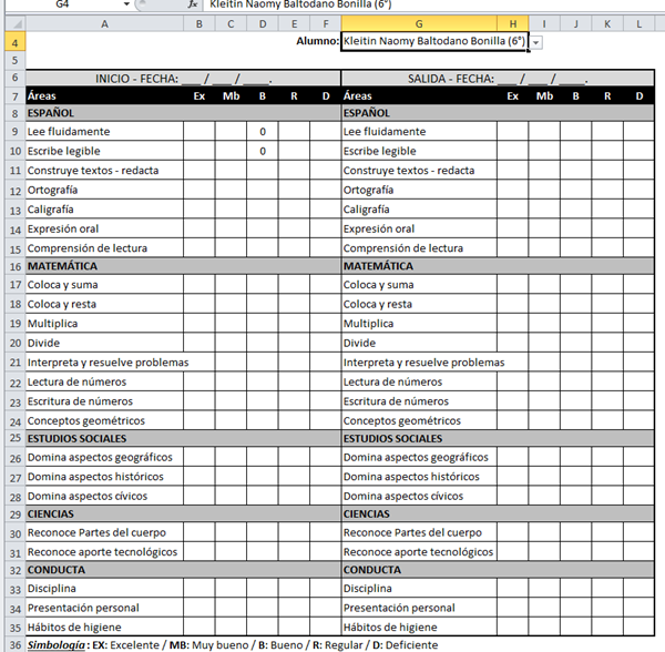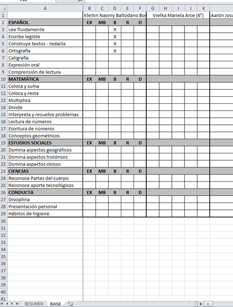 Ase" que es donde ingresaría toda la información de los alumnos, está acomodada de la siguiente manera: en la columna A las distintas áreas con sus respectivos ítems. En la Fila 1, los nombres de los alumnos, Fila 2, escalas.