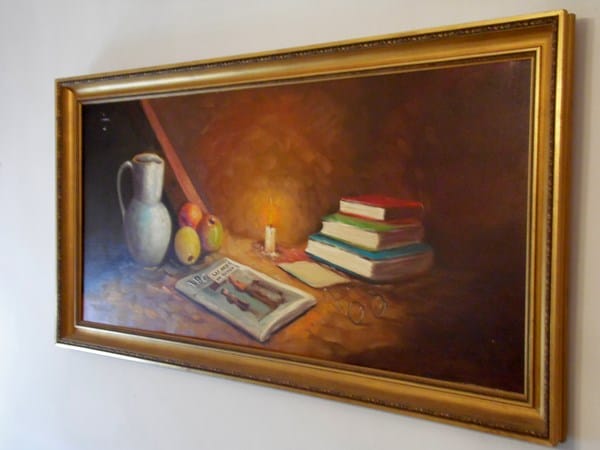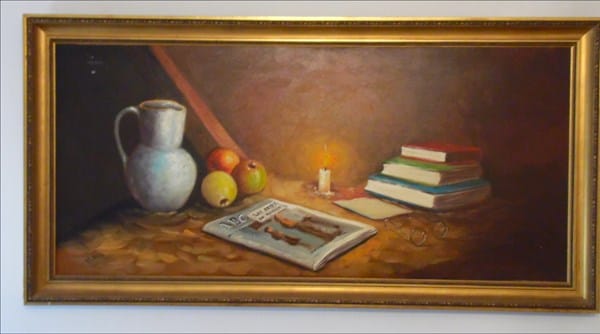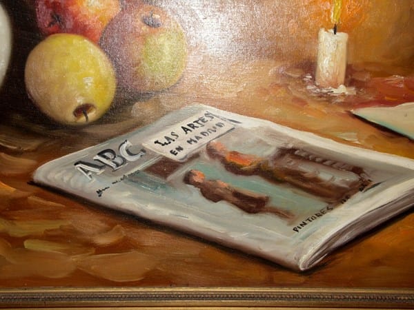 Un familiar va a poner a la venta la casa del pueblo y nos gustaría saber más sobre algunos cuadros que posee. Óleo sobre lienzo. Bodegón con fruta, libros y un periódico con las siglas ABC. También se lee Las artes en Madrid. Está firmado por “Masa” o algo similar. Su tamaño sin marco es de 130 x 60 cm aproximadamente. Agradecería si pudieran ayudarme a identificar al autor y su posible valor. Muchas gracias.