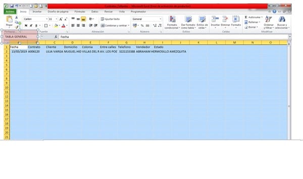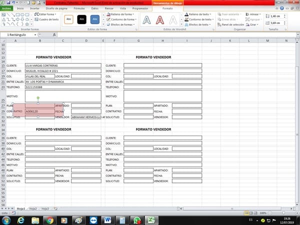 Bonito día! Se tiene un formato en word que pasé a excel, en ese formato se tiene que llenar diferentes campos: Cliente, Domicilio, Tel, Observación, Fecha.. Etc. Distribuidos en fila hacia abajo.