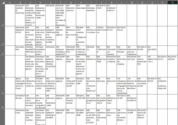 Tengo una hoja de Excel 2016 con 44.000 filas. Cada fila contiene los datos bibliográficos de un libro. La columna A está en blanco para poder copiar en sus celdas.