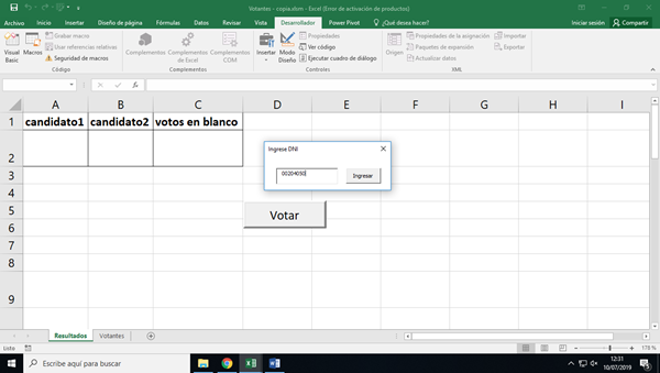 Tengo un libro en excel donde estoy trabajando una base de datos para votaciones, donde la macros debería funcionar que al momento de darle click al votar primero me cargue un pequeño formulario donde me pida el DOCUMENTO, lo cual ya se encuentran registrados en la hoja "Votantes"y lo cual se va ir incremento, pero teniendo en cuenta que si el documento ingresado no existe me arroje un mensaje que ese documento no existe en la base de datos y si existe me lleve al siguiente formulario.