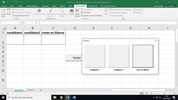 Aqui en este formulario esta compuesto de 3 botones de comandos que una vez le de click a uno de ellos me tiene que aparecer un mensaje donde diga esta seguro que quiere votar por este candidato y si es si me tiene que contabilizar su voto en la hoja resultado y se cierre el formulario.