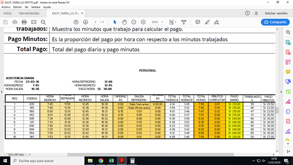 Y este es el archivo de excel donde me falta calcular las columnas de SALIDA REFRIGERIO, PAGO DIARIO, MINUTOS TRABAJADOS, PAGO MINUTOS Y TOTAL PAGO.