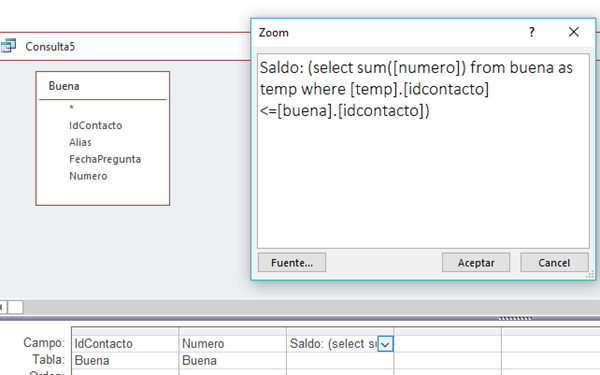 ¿Queria hacerles una consulta sobre la formula DSUM... Se puede usar en un campo generado en una consulta?... Necesito que en un campo me vaya acumulando (sumando) los valores