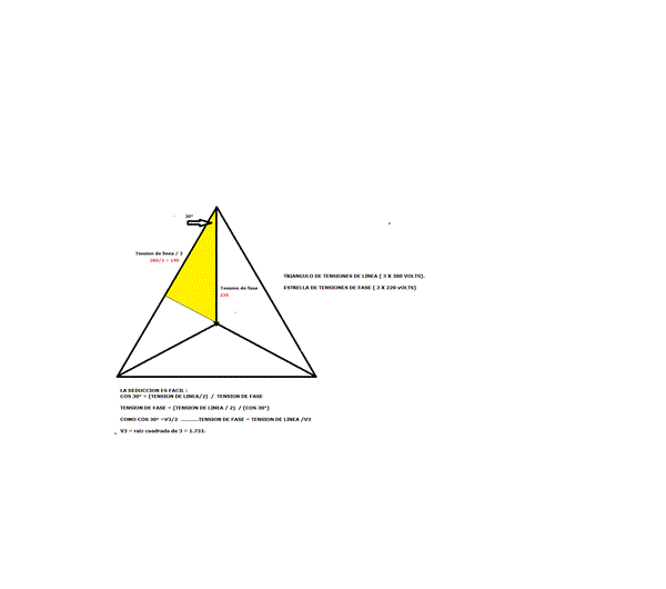 La relacion entre tension de linea y tension de fase = V3 = 1.732  ...si dividis 380/1.732= 220 volts.Sale de una relacion goemetrica de tensiones.