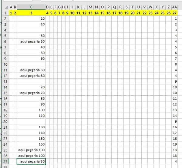 Sigue recorriendo AA14=10 y en C 14=70. El valor 10 se pepite en AA15 y C15, está vacía. Entonces, pega el valor 70.
