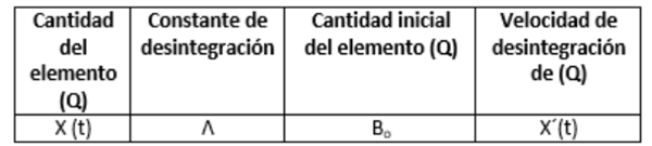 Un reactor transforma un elemento químico Q en otro estable para uso agroindustrial. Después de 20 años se encuentra que el 0,006 % inicial del elemento se ha desintegrado. Este elemento químico tiene una vida media cuya rapidez de desintegración es proporcional a la cantidad presente. En la siguiente tabla se muestran las variables que se utilizaran en el modelo: