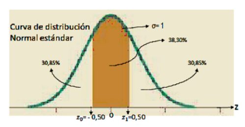 Una textilera produce diariamente rollos de tela con una longitud promedio de 50 m y una desviación estándar de 3 m, por rollo. El jefe de control de calidad especifica que solo serán aceptados aquellos rollos que tengan una longitud entre 48.5 y 51.5 metros, luego de transformar la variable aleatoria X en la variable Z se presenta la siguiente gráfica de distribución normal estándar.