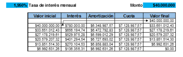 Una persona adquiere un préstamo por $40.000.000 y la siguiente tabla de amortización muestra las características de la operación financiera: