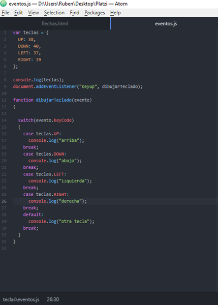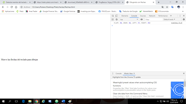 Estoy haciendo un curso online de programación básica en html yJavaScrip. En este momento estamos dibujando líneas en canvas por medio de las flechas del teclado. Resulta que cuando cargo el archivo .html al navegador y pruebo los resultado de presionar las flechas con "console.log" este no me da ningún resultado. No se si es producto de donde estoy realizado el programa que es Atom, o tengo des actualizado algo más.