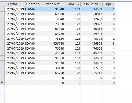 Tengo una tabla con dos totales Peso neto y peso bruto, que va por paquetes de 4