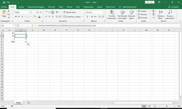 Tengo una hoja de calculo excel donde la columna "A" hay datos de carácter numéricos con decimales ejemplo: A2= 4,3 lo que pretendo hacer es redondear los numero en la columna del lado "B" B2= 5, lo que pretendo hacer es que si el numero se pasa así sea un decimal pase al siguiente entero .