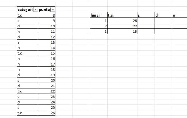 tengo una columna con categorías T.C. = todo competidor senior= S, Damas=D, niños=N y en la otra columna el puntaje sacado al competir necesito una función que me busque el primer lugar el segundo lugar y el tercer lugar pero que haga la distinción por categorías, intenté con el k.esimo.mayor pero no me las distingue por categoría, adjunto ejemplo