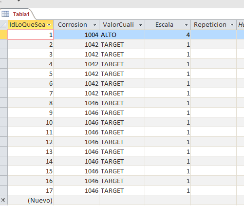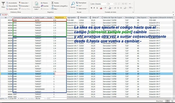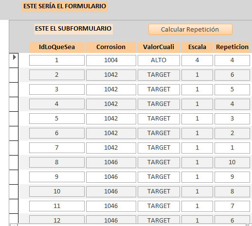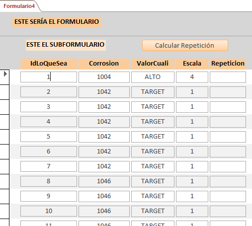 Private Sub Comando11_Click() DoCmd.GoToRecord , , acFirst Dim i As Integer, Cuantos As Integer For i = 1 To Me.Recordset.RecordCount Cuantos = DLast("idloquesea", "tabla1", "corrosion=" & Me.Corrosion & "") If IdLoQueSea = Cuantos Then Repeticion = Escala Else Repeticion = DSum("escala", "tabla1", "idloquesea between " & Me.IdLoQueSea & " and " & Cuantos & " And Corrosion = " & Me.Corrosion & "") End Sub