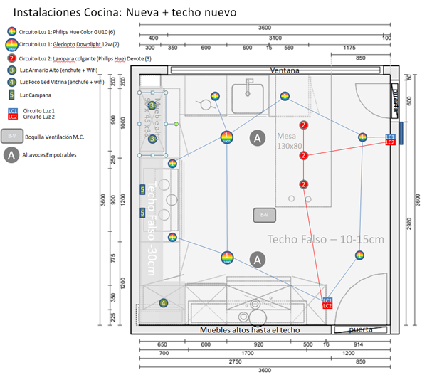 Chalet nueva construcción, vamos a cambiar la distribución y poner una nueva cocina. Aprovechando que vamos a subir el techo de 2,19 a 2,35 en parte (está indicado en el plano abajo), con nuevas instalaciones y quisiéramos aprovechar cambiar la distribución de luces. Ahora hay 1 circuito y me gustaría 2. De momento he comprado unos Philips Hue GU10 Color empotrables para hacer una distribución uniforme de 9 en total (3 x 3), pero estoy leyendo que es mejor unas downlight de iluminación general y poner estos focos empotrables y direccionables para una luz más directa donde hiciera falta.