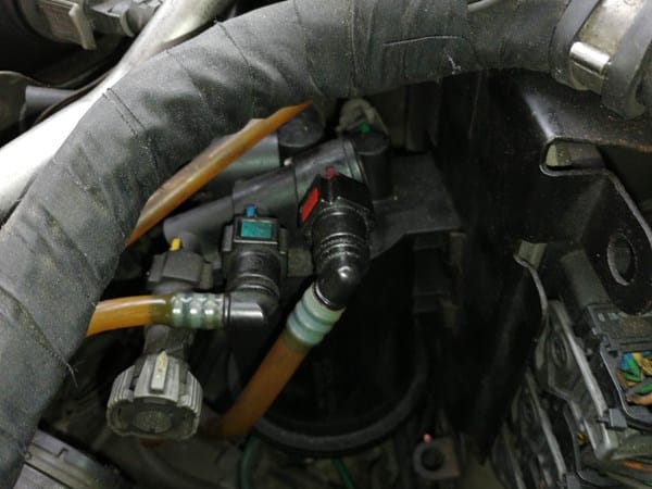 Observamos que hay mucho aire en el circuito ya que se ve pasar a través de los tubos transparentes (incluso se oye burbujear claramente al poner el contacto y estar funcionando la bomba de baja presión) pero en este modelo ni hay purgador de ningún tipo (que hayamos identificado como tal) ni perilla manual para forzar un desgaseado.