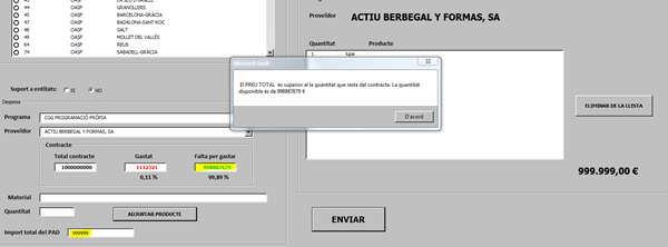 Private Sub Enviar_Click() If falta_gastar.value < total.value Then MsgBox (" El PREU TOTAL és superior al la quantitat que resta del contracte. La quantitat disponible és de " & falta_gastar.value & " €") Total.setfocus Exit Sub Else If totalArt > 0 Then For i = 0 To totalArt - 1 Dades_taulaRow.Range(i + 1, 1).value = Me.num_consecutiu.Caption Dades_taulaRow.Range(i + 1, 2).value = Me.num_equipament_final.Caption Dades_taulaRow.Range(i + 1, 3).value = Me.tipologia_final.Caption Dades_taulaRow.Range(i + 1, 4).value = Me.nom_equipament_final.Caption Dades_taulaRow.Range(i + 1, 5).value = Me.municipi.value Dades_taulaRow.Range(i + 1, 6).value = Me.comarca.value Dades_taulaRow.Range(i + 1, 7).value = Me.provincia.value Dades_taulaRow.Range(i + 1, 8).value = Me.Entitat.Caption Dades_taulaRow.Range(i + 1, 9).value = Me.programa_final.Caption Dades_taulaRow.Range(i + 1, 10).value = Me.FA_final.Caption Dades_taulaRow.Range(i + 1, 11).value = Me.pad_final.Caption Dades_taulaRow.Range(i + 1, 12).value = Me.proveidor_final.Caption Dades_taulaRow.Range(i + 1, 13).value = Me.list_productes.List(i, 0) Dades_taulaRow.Range(i + 1, 14).value = Me.list_productes.List(i, 1) Dades_taulaRow.Range(i + 1, 15).value = Me.total_pad.Caption Dim Cel As Range For Each Cel In Range("O3:O9999") If Not IsNumeric(Cel.value) Then Cel.value = WorksheetFunction.Trim(Cel.value) ElseIf TypeName(Cel.value) = "String" Then Cel.value = Cel.value + 1 - 1 End If Next Cel Dades_taulaRow.Range(i + 1, 16).value = Me.data.value Next i Else MsgBox "No hi ha material a la llista", vbInformation, "Res..." Exit Sub End If End If MsgBox ("ENREGISTRAT CORRECTAMENT") End sub